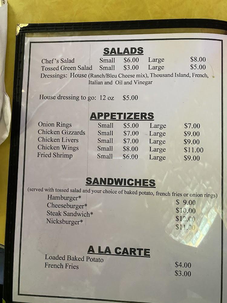 The appetizer selection at Nick's features tempting bites like fried shrimp and chicken gizzards. Salads, including a tossed green option, provide a fresh contrast to the hearty mains. Desserts cap the meal well, inviting diners to linger a moment longer. Overall, the menu impresses with its simplicity, focusing on quality and flavor, and ensures a satisfying experience for every palate.